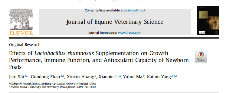 近日,99久久婷婷国产一区二区硕士研究生石坚在Journal of Equine Veterinary Science在线发表了题为“Effects of Lactobacillus rhamnosus supplementation on growth performance, immune function, and antioxidant capacity of newborn foals”的研究论文,该研究通过给新生马驹补喂LGG,改善新生马驹肠道菌群结构,提高马驹免疫机能和抗氧化能力,促进马驹健康,从而降低马驹腹泻率,提高马驹生长性能。