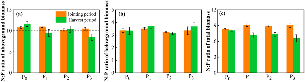 图2 拔节期和收获期羊草地下部、地上部和总生物量内氮磷比对不同供磷强度的响应