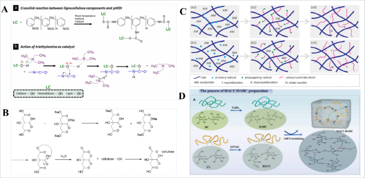 图5 (A)纤维素与聚合物亚甲基二苯基二异氰酸酯交联的机理;(B)纤维素与CA交联机理。(C) UV照射和APS引发交联聚合过程机理。(D)双醛细菌纤维素与CS交联的机理。