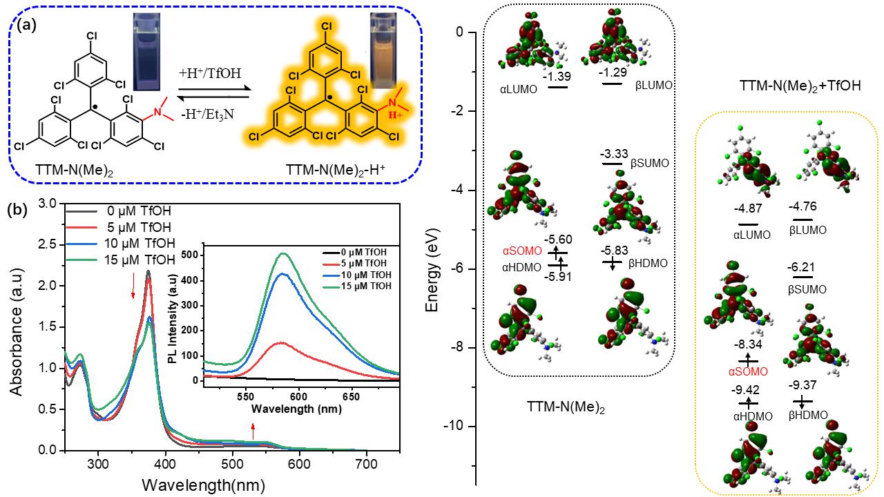 图2(a) 自由基TTM-N(Me)2质子化过程及其在环己烷溶液在365 nm紫外灯下的照片;(b) 自由基TTM-N(Me)2 (10-4mol/L)在环己烷溶剂中加入不同浓度的三氟甲磺酸(TfOH)后的紫外-可见吸收光谱:插图为质子化后的自由基 (TTM-N(Me)2+H)对应的荧光光谱;(c)自由基TTM-N(Me)2 质子化前后的分子轨道能级及其电子云分布情况;
