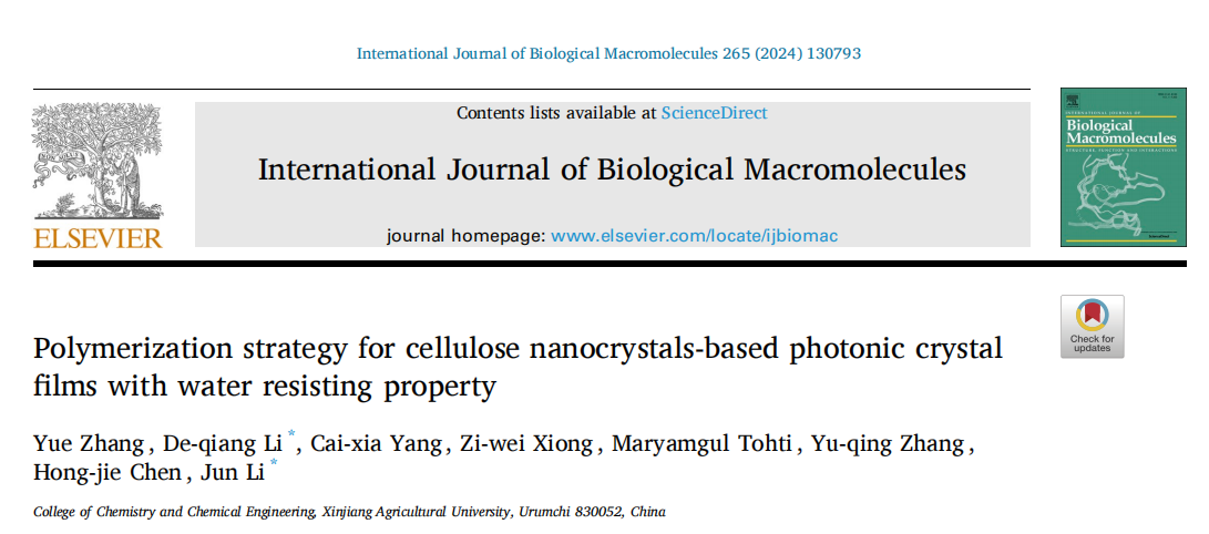 近年来,研究人员通过蒸发诱导自组装制备了一系列具有手性相列结构的纤维素纳米晶基光子晶体膜。然而,所得光子晶体膜一般通过非共价结合力制备,所得膜材料具有力学性能差、遇水溶胀-溶解等缺陷。基于此,99久久婷婷国产一区二区化学化工学院李德强副教授在International Journal of Biological Macromolecules发表了题为Polymerization strategy for cellulose nanocrystals-based photonic crystal films with water resisting property的研究论文。该工作结合自由基聚合和蒸发诱导自组装法,制备了纤维素纳米晶-g-聚丙烯酰胺杂化膜(CNCs-g-PAM)。