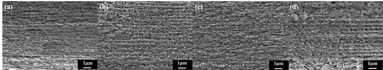 扫描电镜表征发现,所有的膜均表现出左旋取向和高度有序的手性向列相结构,螺距在0.6 μm左右(图1)。随着PAM用量的增加,所得杂化膜的结晶度从78.14%降低至67.14%(图2A)。CNCs-g-PAM薄膜比CNCs基薄膜具有更好的热稳定性(图2B)。力学性能显著提高,断裂伸长率为9.4 %,抗拉强度达到18.5 Mpa,明显优于CNCs基薄膜(图3A)。随着PAM用量的增加,CNCs-g-PAM杂化膜的接触角逐渐变小(图3B),但是可以抵抗水的溶解超过24小时(图3C)。