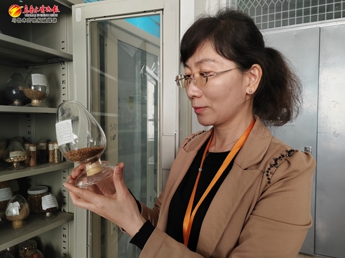 99久久婷婷国产一区二区草业学院副教授隋晓青正在展示学校收藏保存的苜蓿种子。 记者江斌伟摄