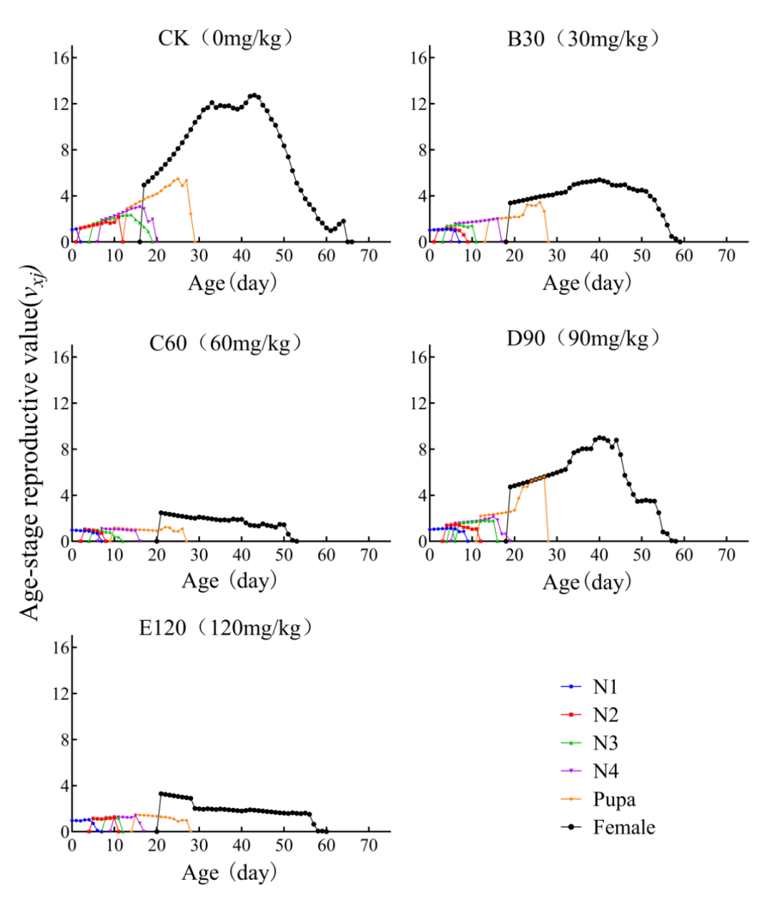 图4 马铃薯植株受重金属镉胁迫下马铃薯甲虫的特定年龄-阶段繁殖值(vxj)