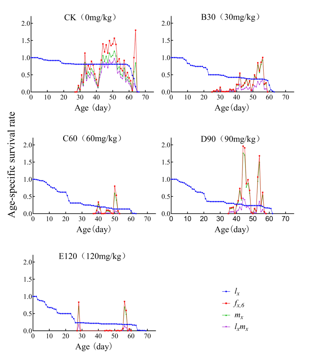 图2 马铃薯植株受重金属胁迫下马铃薯甲虫的特定年龄存活率(lx)、雌虫特定年龄繁殖力(fx,6)、