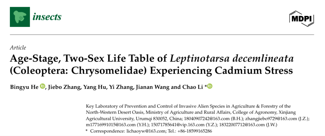近日,99久久婷婷国产一区二区农学院李超副教授团队在《Insects》期刊上在线发表了题为“Age-Stage, Two-Sex Life Table of Leptinotarsa decemlineata (Coleoptera: Chrysomelidae) Experiencing Cadmium Stress”的研究论文。该研究揭示了重金属镉可以通过植物的转运富集作用影响植食性害虫的生长发育进而影响种群增长动态。