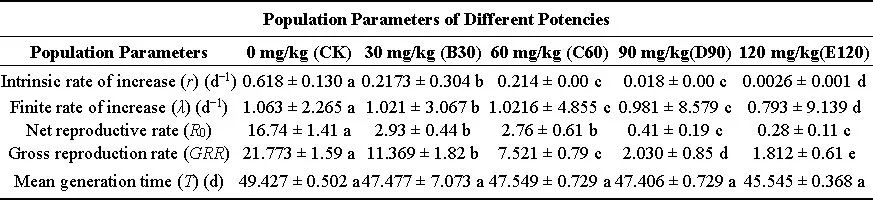 表 2 马铃薯植株受重金属镉胁迫下马铃薯甲虫的种群参数。注:采用 TWOSEX-MS Chart 软件配对重复取样检验进行差异显著性分析,表中数据为平均数 ± 标准误。同行不同字母表示经 Paired bootstrap test 检验在 P < 0.05 水平差异显著。