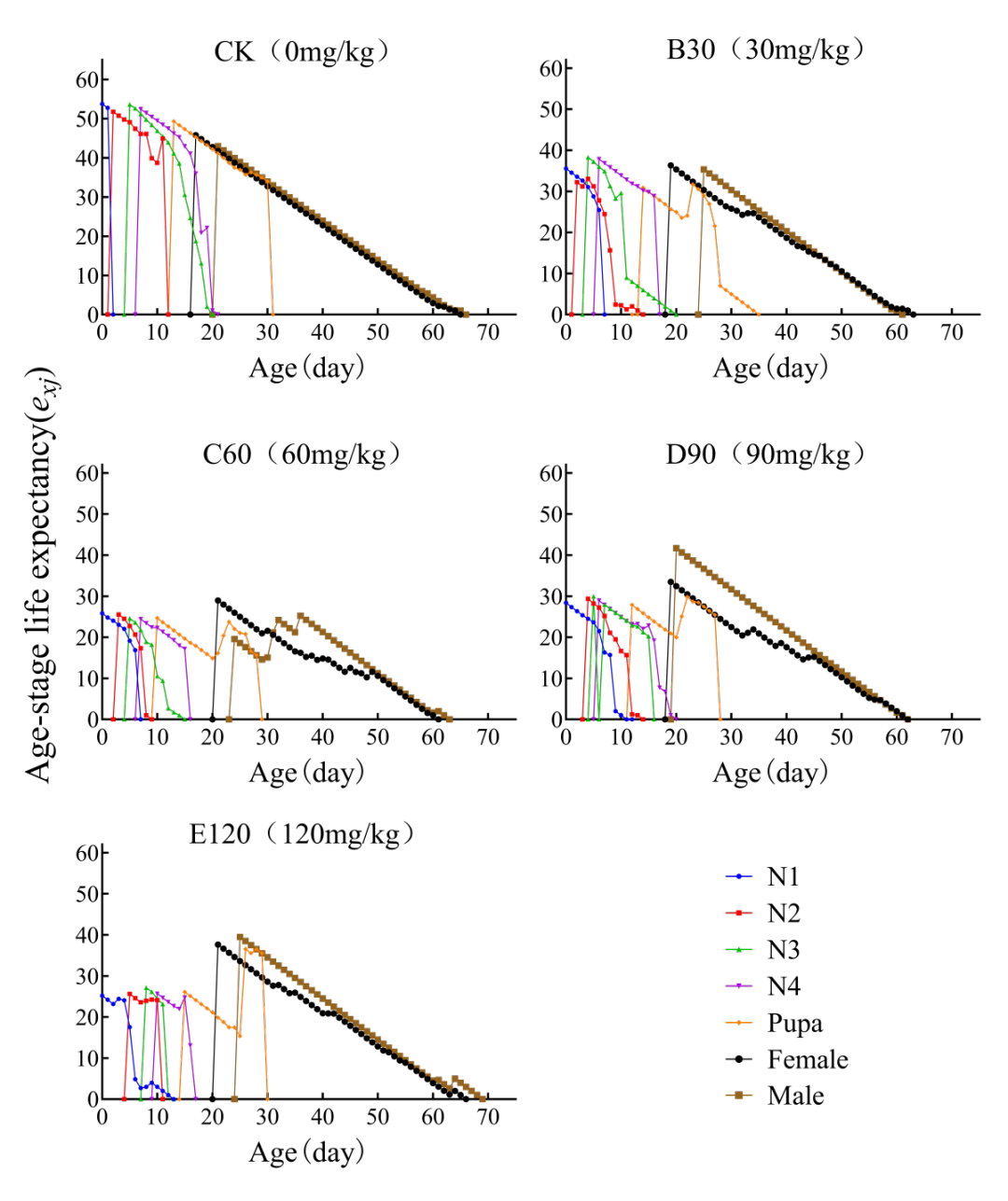 图3 马铃薯植株受重金属镉胁迫下马铃薯甲虫的特定年龄-阶段生命期望(exj)