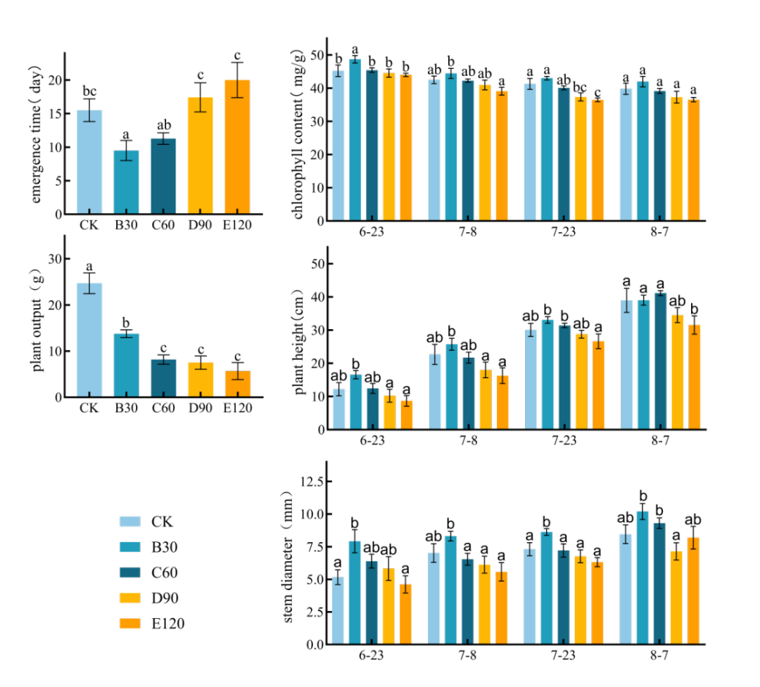 图S1 不同浓度镉处理对马铃薯出苗、生长和产量的影响。(A)马铃薯出芽时间。(B)马铃薯单株块茎产量。(C)马铃薯植株叶片叶绿素含量。(D)马铃薯植株平均高度。(E)马铃薯植株平均茎粗。
