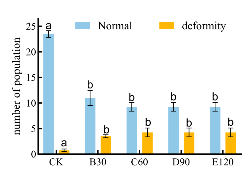 图5 马铃薯植株受重金属镉胁迫下马铃薯甲虫的畸形数量。注:图中的数据为平均率±标准误差;