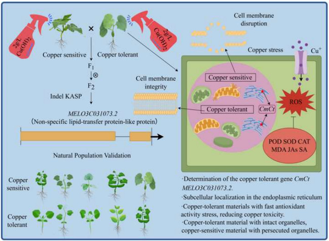 该研究从甜瓜耐铜性状评价、材料筛选、群体构建角度出发,利用BSA-seq技术,同时开发Indel和KASP标记,明确甜瓜耐铜性状受一对隐性核基因调控。利用F2群体进行为期进行三年一点试验,精细定位甜瓜耐铜关键基因;明确甜瓜耐铜性的关键基因CmCt(MEL03C031073.2),并在自然群体中进行验证;明确该基因编码一种非特异性脂质转移蛋白样蛋白(nsLTP),定位于内质网(ER);同时耐铜材料在铜胁迫下表现出快速的抗氧化还原系统反应,确保了叶细胞的稳定性和结构完整性。本研究基于生理学和分子生物学方法为挖掘关键耐铜基因提供了一种有效的方法,可以为耐铜甜瓜提供新的育种策略。这对未来环境的可持续发展和铜污染的减少具有重要意义。