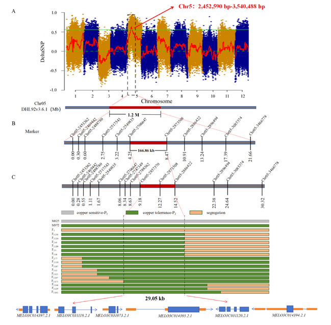 Figure 7. Bulk segregant analysis (BSA) targeting and fine mapping of genes controlling copper tolerance in melon through analysis of recombinant recessive individuals