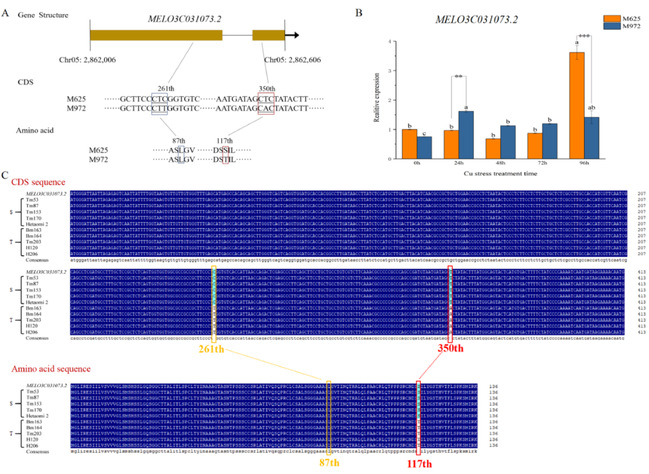 Figure 8. Comparison analysis of MELO3C031073.2 Gene Structure, Specific Expression, and Natural Population Validation.